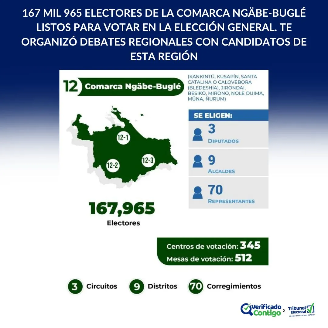 La comarca Ngäbe-Buglé cuenta con 167,965 ciudadanos habilitados para ejercer el voto el día de la Elección General del 5 de mayo de 2024. De estos electores que participarán en la contienda electoral, 81,961 son mujeres y 86,004 son hombres.