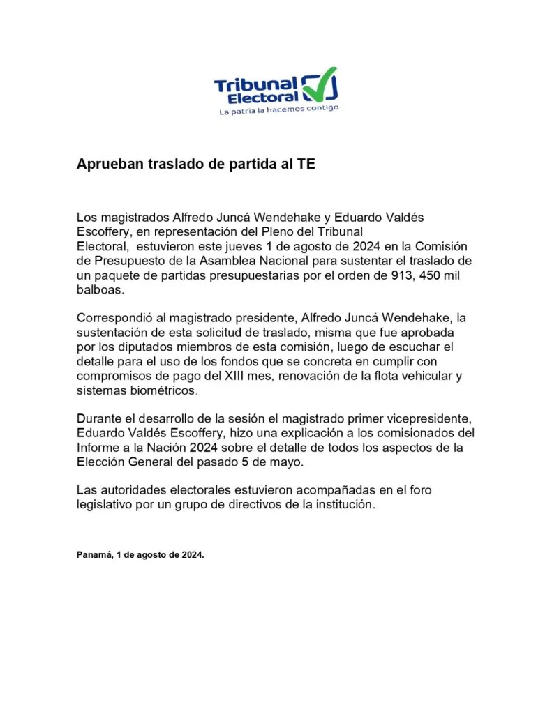 La Comisión de Presupuesto de la Asamblea Nacional aprobó al Tribunal Electoral un traslado de partida presupuestaria por el orden de 913, 450 mil balboas, que será utilizada por la institución para cumplir con compromisos de renovación del sistema biométrico y de la flota vehicular, así como para el pago del XIII mes de sus colaboradores.