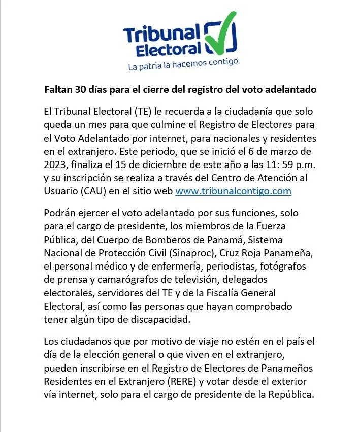 Para ello, estos electores deben inscribirse, a más tardar el 15 de diciembre de 2023, en el registro de electores para el voto adelantado por Internet, en una de sus dos modalidades, que son el Registro de Electores Residentes en el Extranjero (RERE) y el Registro de Electores del Voto Adelantado para los residentes en Panamá (REVA).