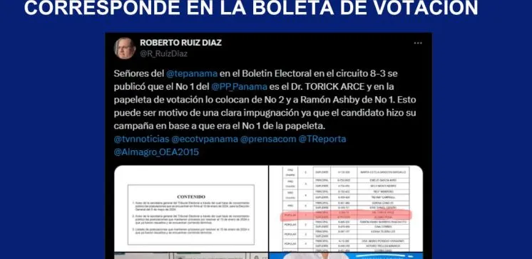 No es cierto lo que se afirma en este mensaje que se ha publicado en redes sociales. El candidato a diputado Torick Arce aparece en la posición que le corresponde en la boleta única de votación. En este sentido es importante aclarar lo siguiente: Cada partido político le envía al Tribunal Electoral (TE) una nota […]