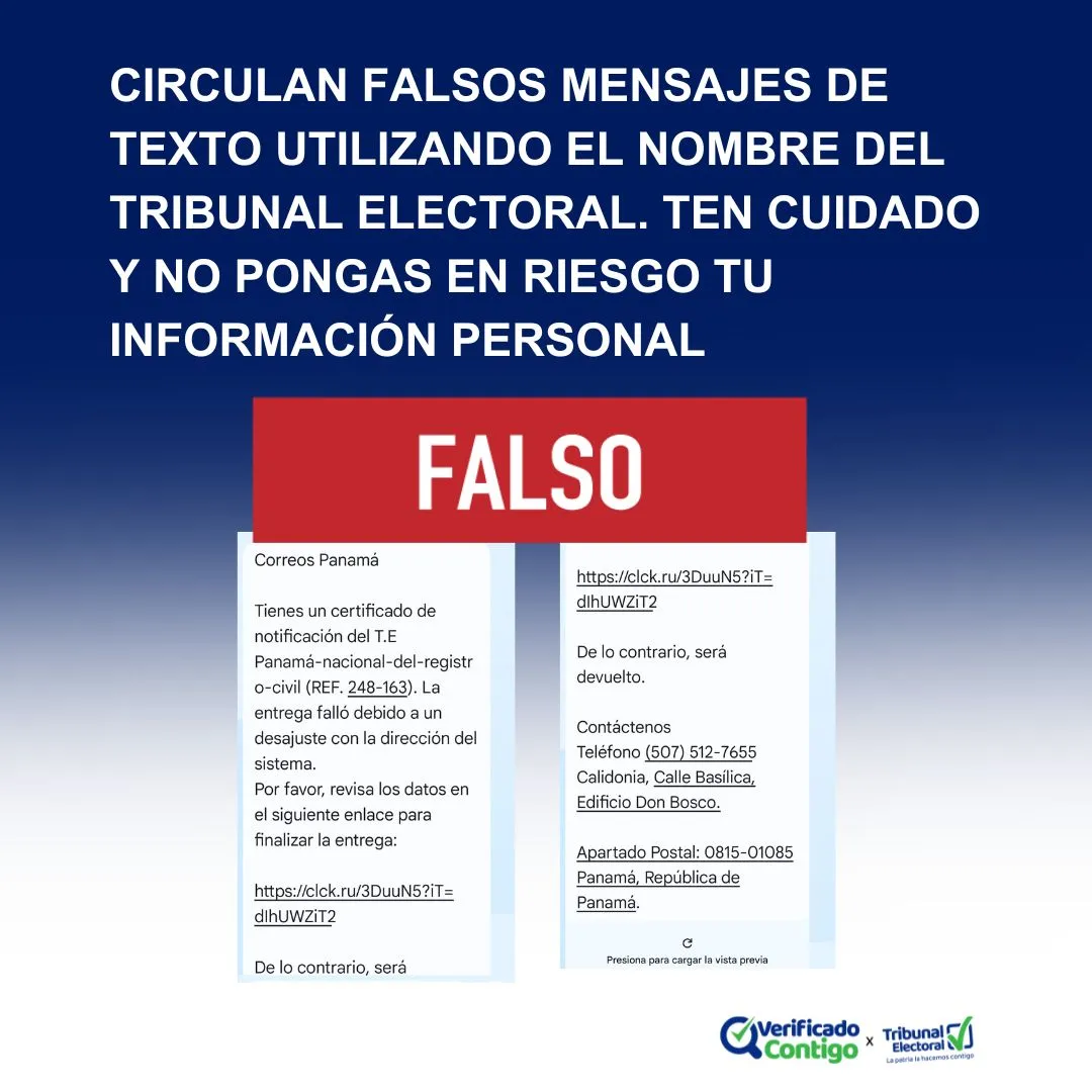 Usuarios informaron a VerificadoContigo haber recibido un mensaje de texto (SMS), aparentemente proveniente del Tribunal Electoral (TE), en el que se les pedía ingresar a un enlace para poder culminar con un trámite.