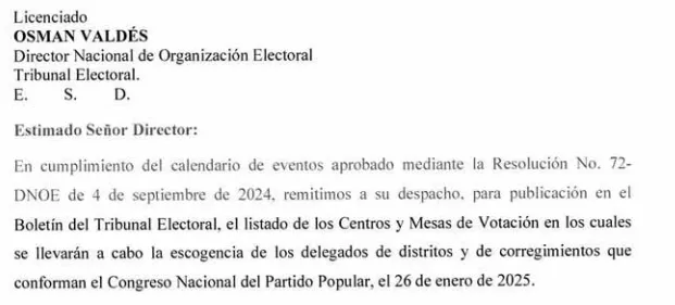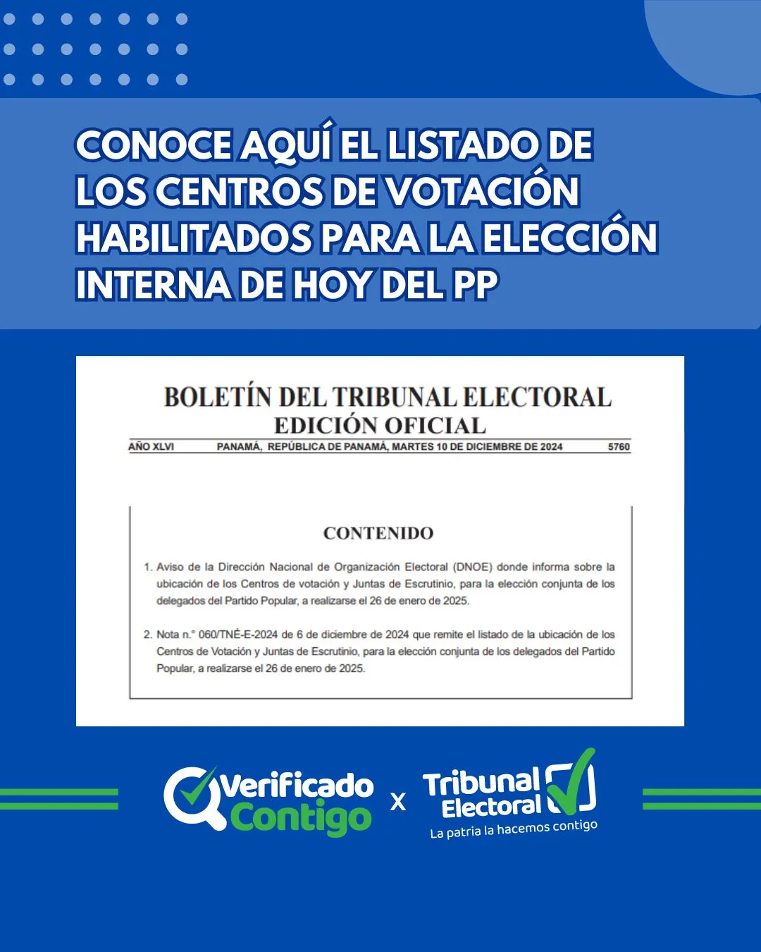 El listado de sede de los centros de votación y juntas de escrutinio para la elección conjunta de los delegados de corregimiento y delegados del distrito del Partido Popular (PP) para hoy domingo 26 de enero de 2025 fue publicado debidamente en el Boletín Electoral 5760 de martes 10 de diciembre de 2024.