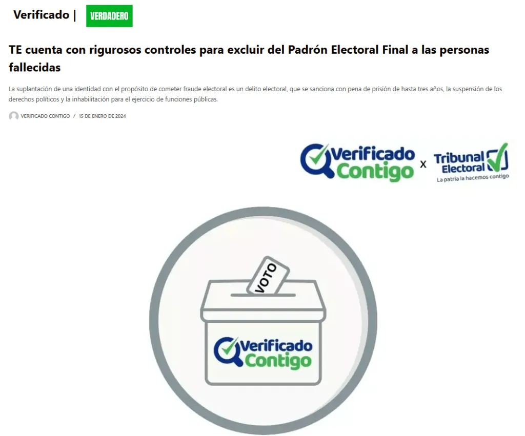 Por medio de la categoría VERDADERO, Verificado Contigo hizo docencia sobre el tema, explicando los rigurosos controles que tiene la institución para excluir a las personas fallecidas del Padrón Electoral Final, es decir, del documento oficial y exclusivo en el que aparecerían registrados los electores con derecho a votar el 5 de mayo de 2024.