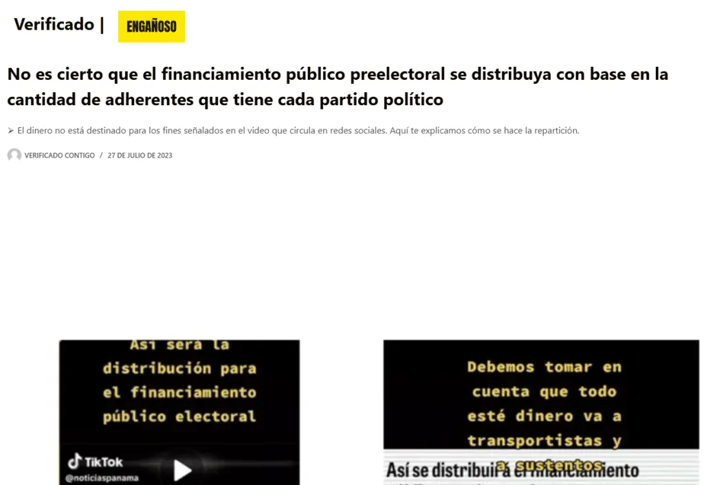 Verificado Contigo, por medio de la categoría ENGAÑOSO, desmintió desinformaciones generadas acerca del financiamiento, dando a conocer cómo se repartía el financiamiento preelectoral entre los partidos políticos y candidatos por libre postulación, de acuerdo con lo establecido en la norma electoral.
