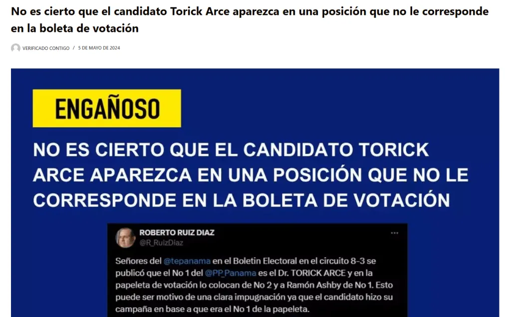 Respuesta: Se hizo un análisis del contenido y se constató que la información era engañosa, debido a que el día de los comicios generales el candidato en cuestión sí estaba ubicado en la posición que le correspondía (número 2), conforme a lo plasmado en el Boletín Electoral 5548-A del jueves 12 de enero de 2024.