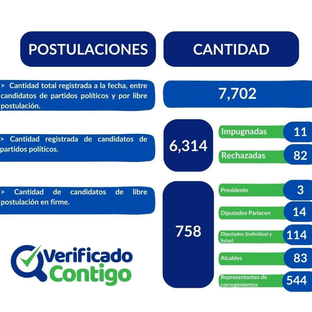 En cuanto a la libre postulación, ya quedaron en firme los 758 candidatos, distribuidos así: 3 para presidente; 14 para diputado al Parlacen; 114 para diputados (individual y listas); 83 para alcaldes y 544 para representante de corregimiento.