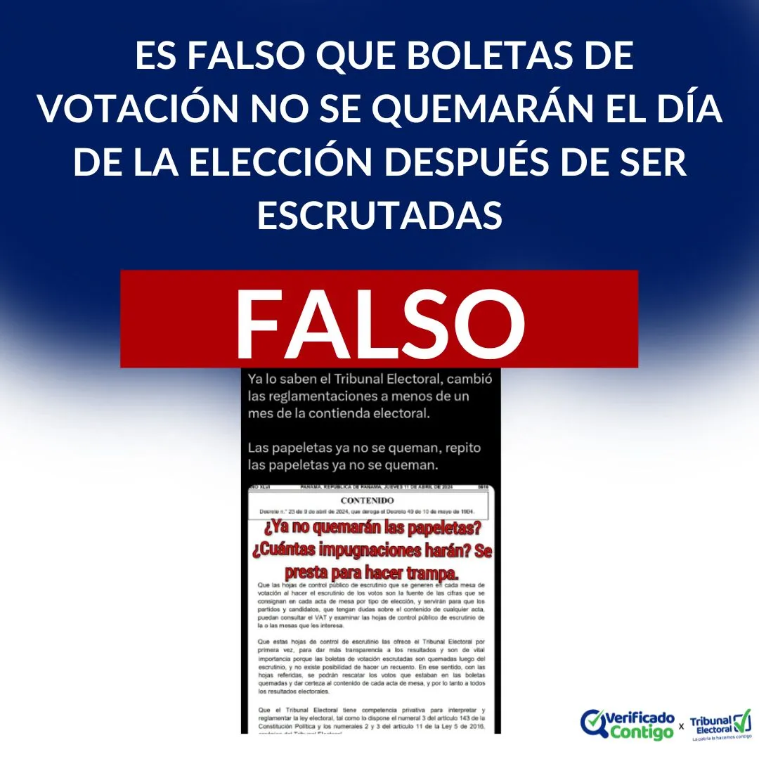 Es completamente falso este mensaje que se ha publicado en redes sociales, en el que se afirma que las boletas de votación no serán quemadas el 5 de mayo de 2024, día de la Elección General.