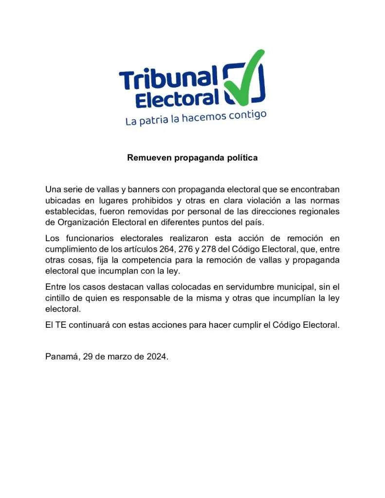 En cumplimiento de los artículos 264, 276 y 278 del Código Electoral, la entidad ha procedido a la remoción de toda la propaganda electoral que incumpla con la Ley.