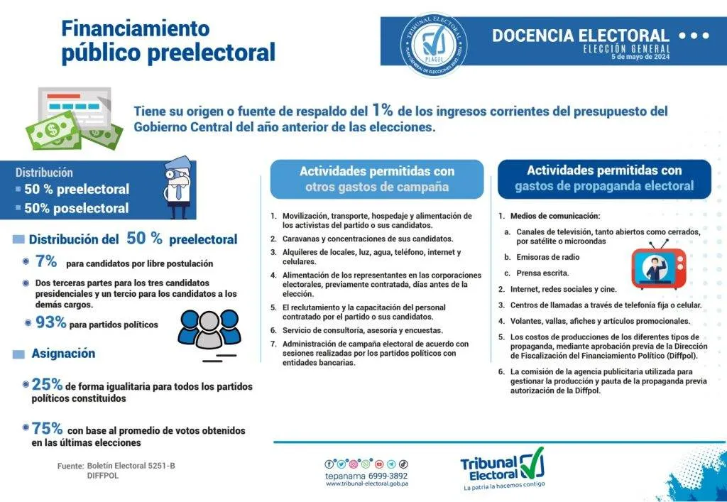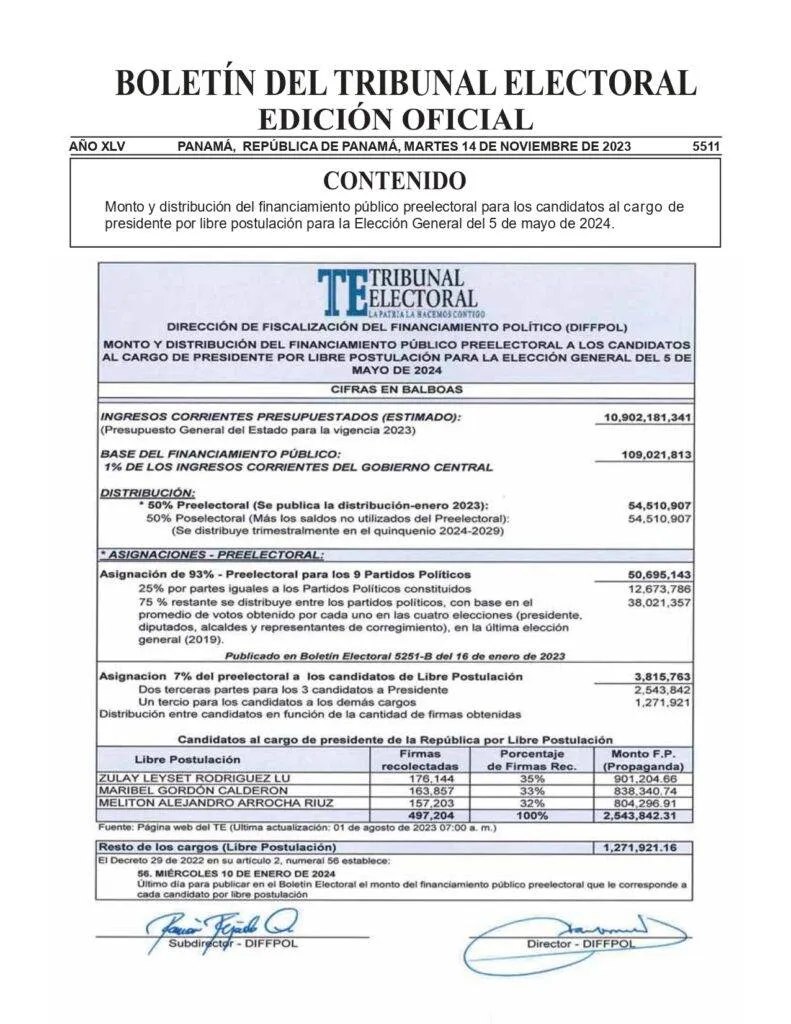 ⮚El Tribunal Electoral, a través del Boletín Electoral 5511, dio a conocer a la población el monto y distribución del financiamiento público preelectoral que le corresponde a los candidatos al cargo de presidente por libre postulación para la Elección General del 5 de mayo de 2024.
