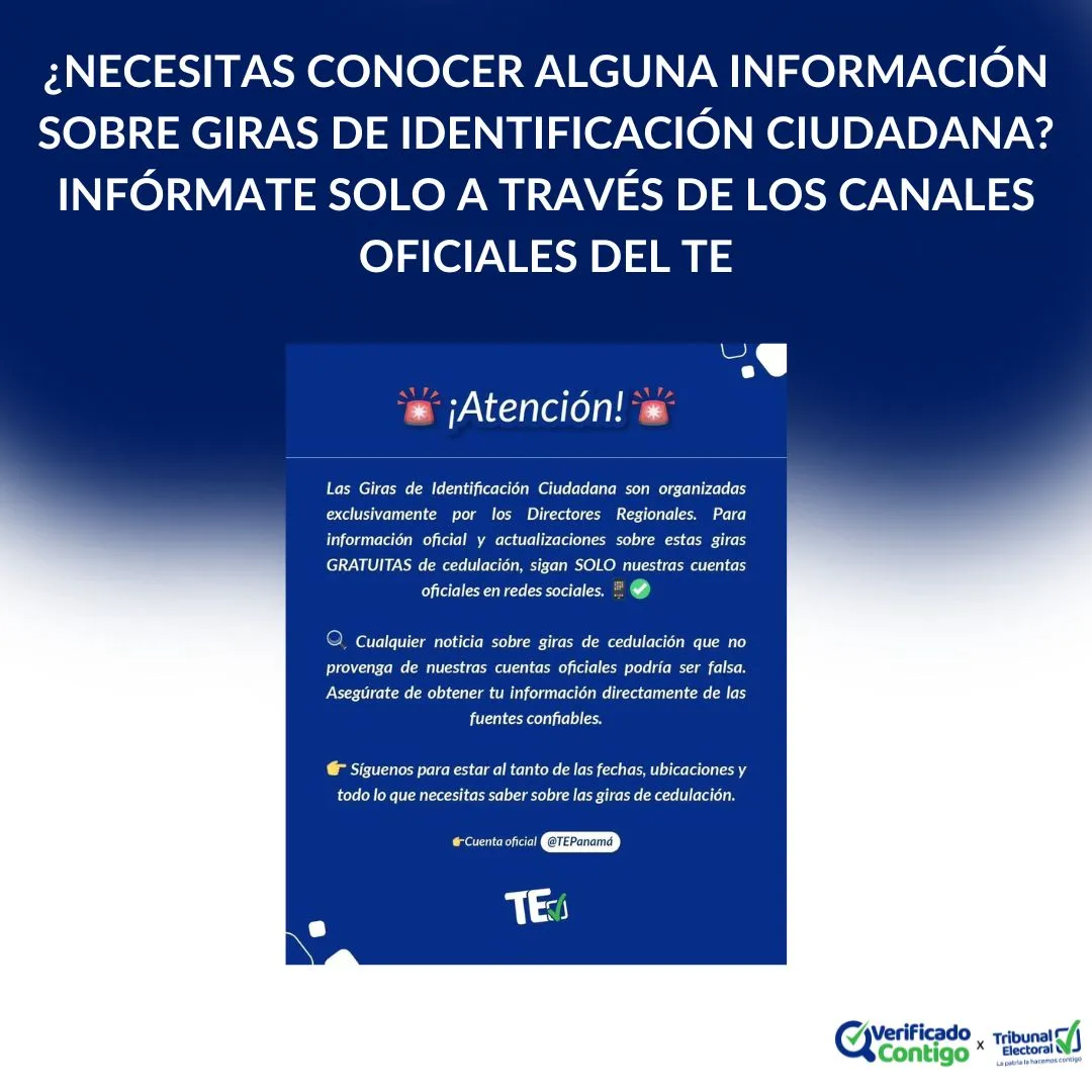 El Tribunal Electoral (TE) reiteró a la ciudadanía que cualquier noticia o información relacionada con las giras de identificación ciudadana que no provenga de las cuentas oficiales de la institución podría ser falsa.