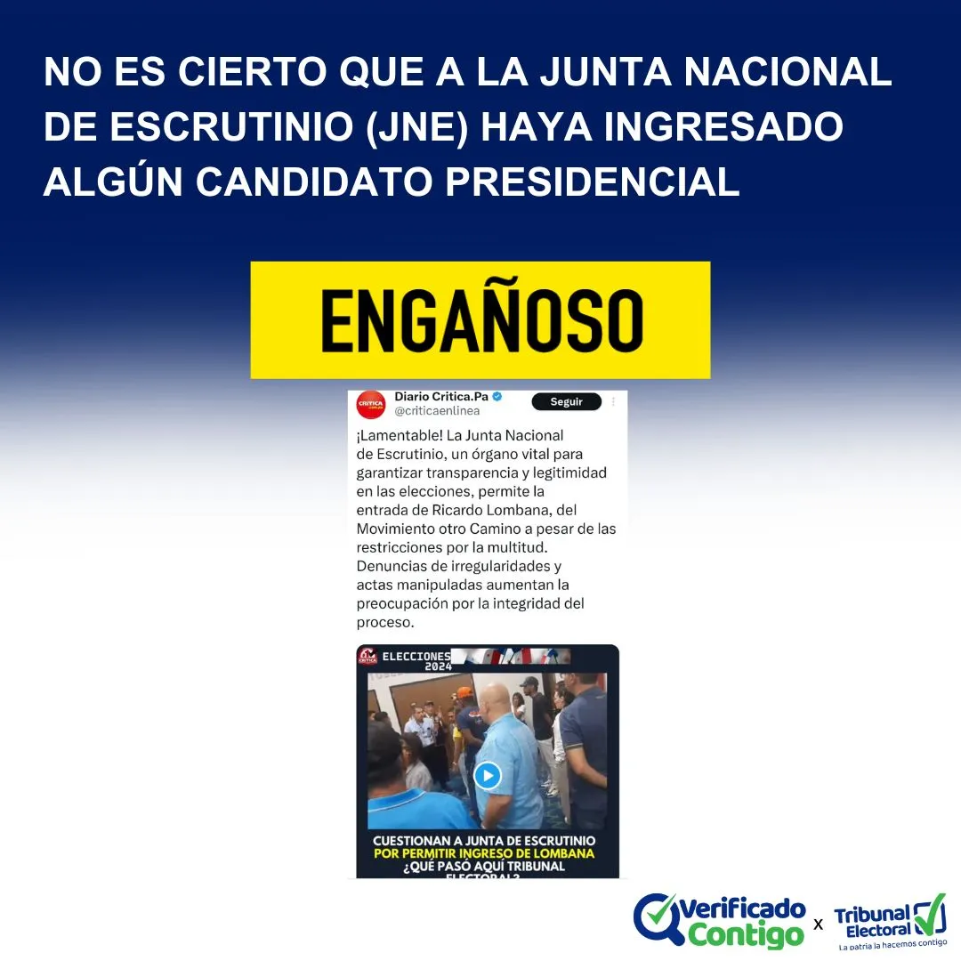 Ni el candidato Ricardo Lombana, del partido Movimiento Otro Camino (MOCA), ni ningún otro ha ingresado a la Junta Nacional de Escrutinio (JNE), cuya sede está ubicada en el Parlatino de la ciudad capital.