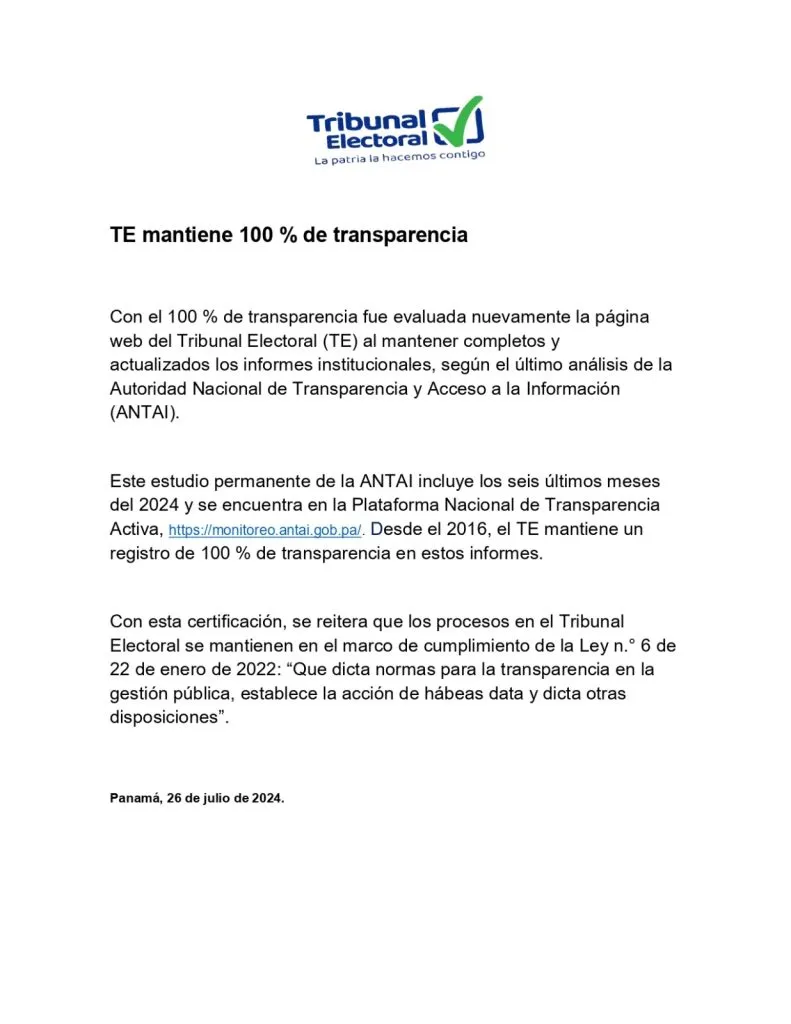 El Tribunal Electoral (TE) dio a conocer que la página web de la institución www.tribunal-electoral.gob.pa ha obtenido nuevamente la máxima calificación en la evaluación realizada por la Autoridad Nacional de Transparencia y Acceso a la Información (ANTAI).