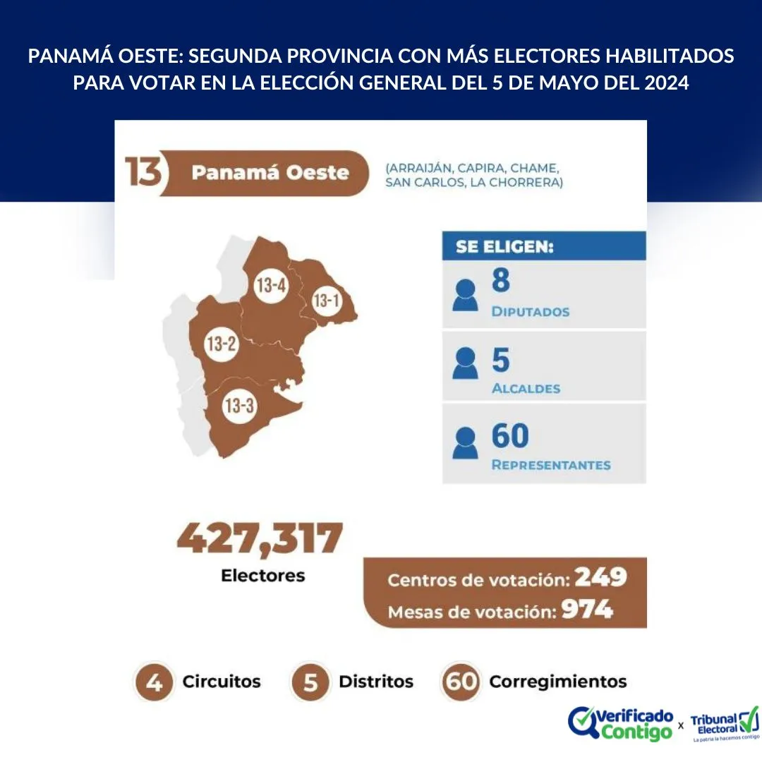 Según las estadísticas del Padrón Electoral Final, la provincia de Panamá Oeste tiene 427,317 personas habilitadas para votar en la Elección General del 5 de mayo de 2024, ubicándose en el segundo lugar con más electores a nivel nacional. De esta población, unas 217,018 son mujeres y 210,299 son hombres.