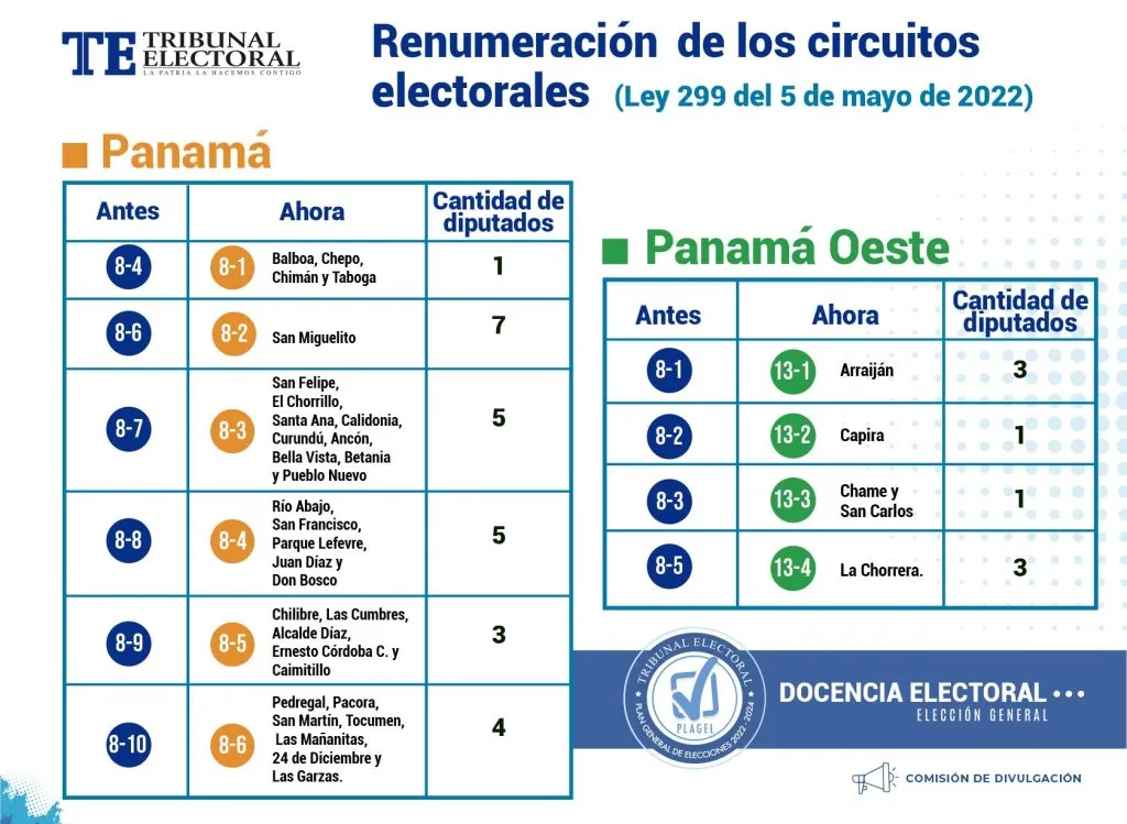 Los cuatro circuitos de la provincia de Panamá Oeste pasan a ser identificados con el número 13, mientras que la provincia de Panamá queda con seis (6) circuitos electorales reconocidos con el número 8, esto de acuerdo con la Ley 299, aprobada por la Asamblea Nacional, que reconfigura los circuitos electorales cambiando algunas numeraciones.