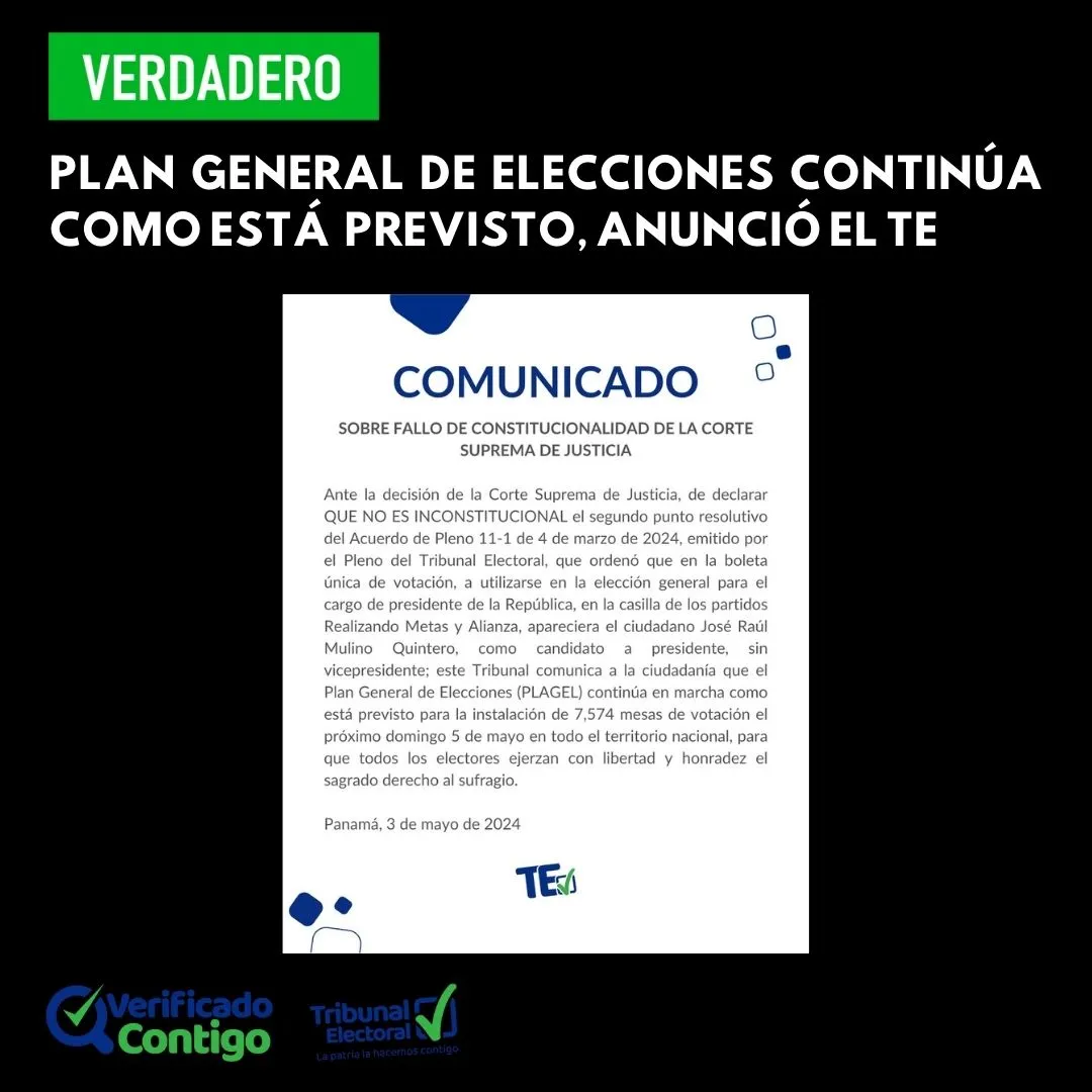 Luego de que la Corte Suprema de Justicia (CSJ) declarara que no es inconstitucional el segundo punto resolutivo del Acuerdo de Pleno 11-1 de 4 de marzo de 2024, emitido por el Pleno del Tribunal Electoral con relación a la candidatura presidencial del candidato José Raúl Mulino por los partidos Realizando Metas y Alianza, la institución informó a la ciudadanía que el Plan General de Elecciones (PLAGEL) continúa en marcha como está previsto, para que todos los electores ejerzan con libertad y honradez su derecho al voto este 5 de mayo de 2024, día de la Elección General.