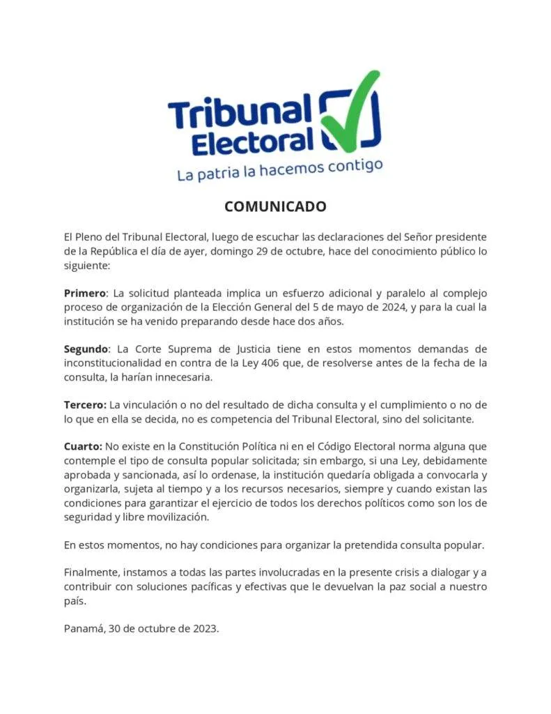 ⮚En conferencia de prensa, los magistrados del Tribunal Electoral instaron a todas las partes involucradas en la presente crisis a dialogar y a contribuir con soluciones pacíficas y efectivas que le devuelvan la paz social a nuestro país.