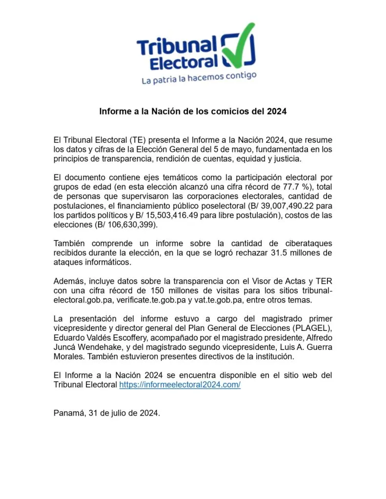 El Tribunal Electoral (TE) presentó hoy el Informe a la Nación 2024, que resume los datos y cifras de las Elecciones Generales del 5 de mayo de este año.