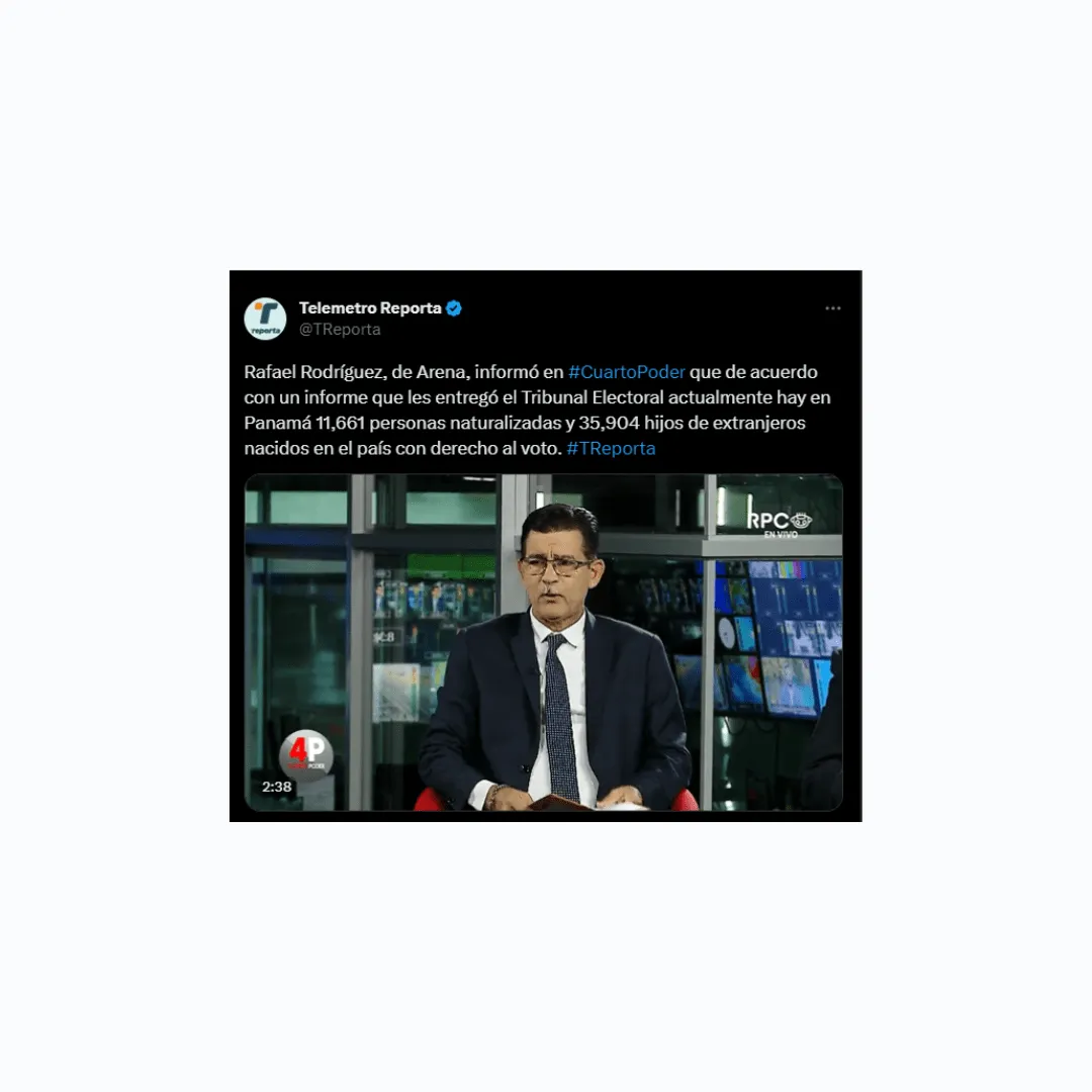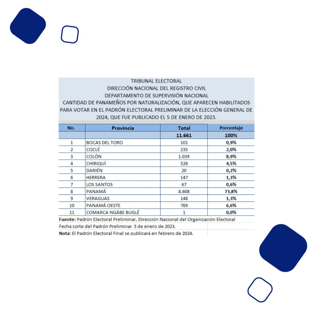 De acuerdo con cifras estadísticas de la Dirección Nacional de Registro Civil del Tribunal Electoral (DNRC), unos 11 mil 661 panameños por naturalización están registrados en el Padrón Electoral Preliminar (PEP), para la Elección General de 2024.