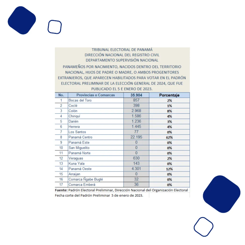 En este informe también se destaca que la cantidad de panameños nacidos dentro del territorio nacional (Panamá), que son hijos de padre o madre extranjeros, es de 35 mil 904 personas. Estos panameños, de igual manera, aparecen inscritos en el PEP.