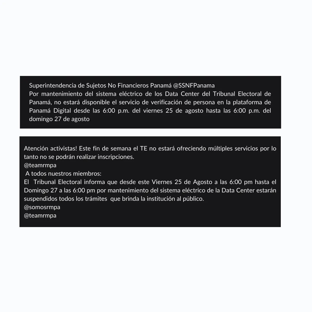 Desde las 6:00 de la tarde de este viernes 25 hasta las 6:00 p.m. del domingo 27 de agosto, el Tribunal Electoral realizará trabajos de mantenimiento al sistema eléctrico de su centro de datos, por lo que no brindará, durante ese periodo, los siguientes servicios: