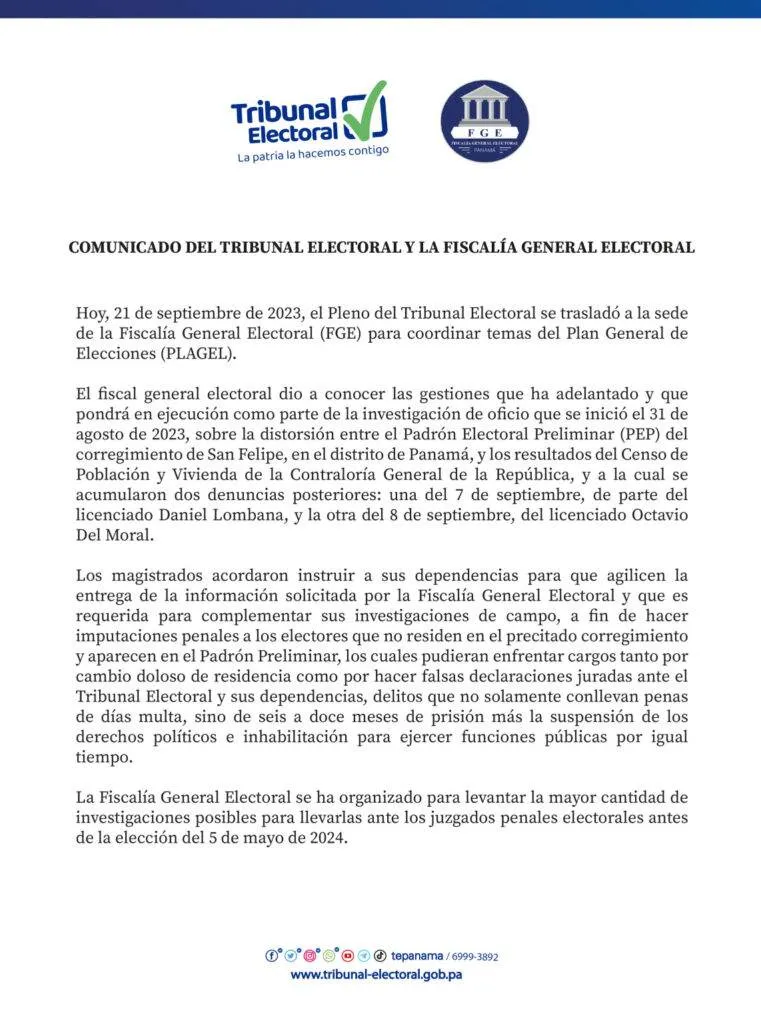 El Pleno del Tribunal Electoral (TE) acordó instruir a sus dependencias para que agilicen la entrega de la información solicitada por la Fiscalía General Electoral (FGE), a fin de contribuir con la investigación que se está llevando a cabo en torno a la distorsión que existe entre el Padrón Electoral Preliminar del corregimiento de San Felipe y los resultados del Censo de Población y Vivienda de la Contraloría General de la República.