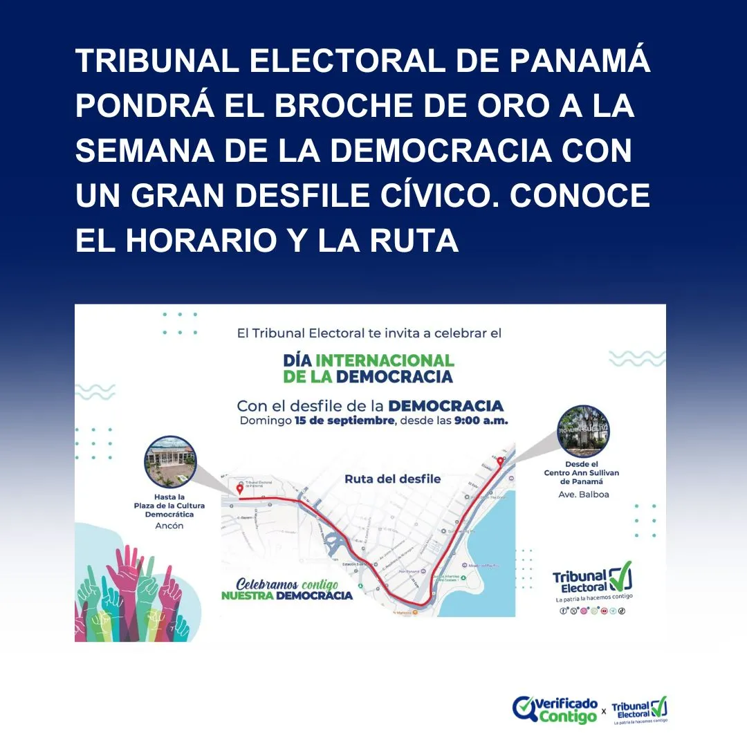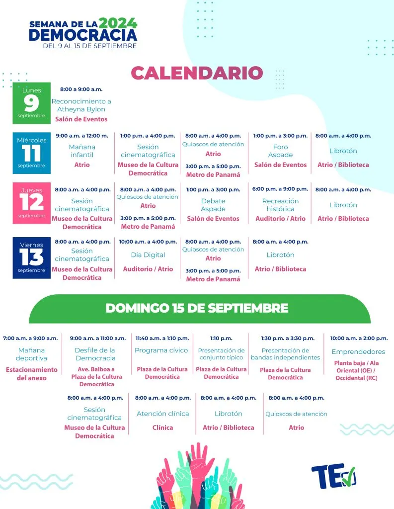 La Semana de la Democracia, que comienza desde este lunes 9 de agosto, culminará el domingo 15 de septiembre, fecha en la que se conmemora el Día Internacional de la Democracia, con un gran desfile cívico, que saldrá de la Ave. Balboa a las 9:00 a.m., con la participación de delegaciones estudiantiles y conjuntos típicos.