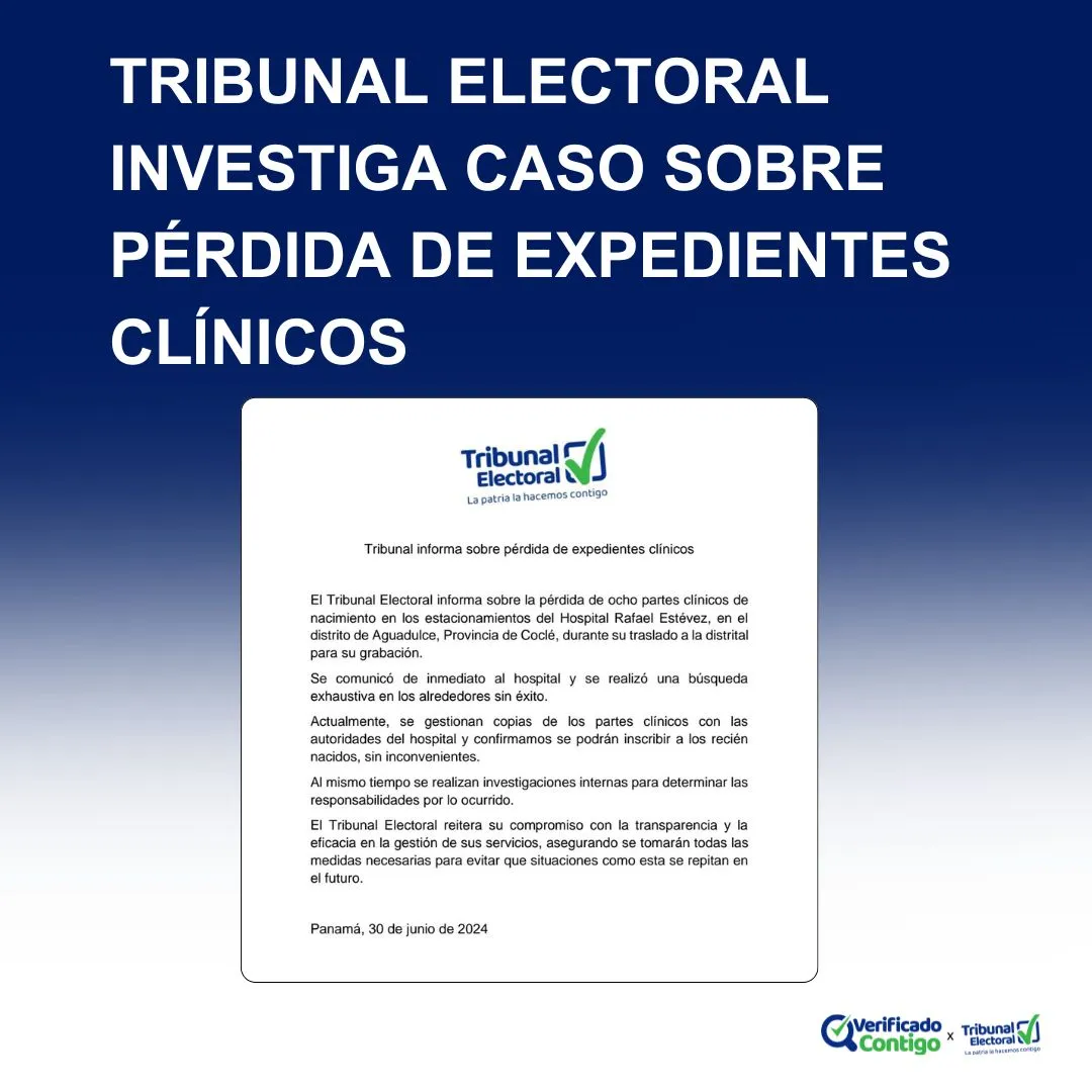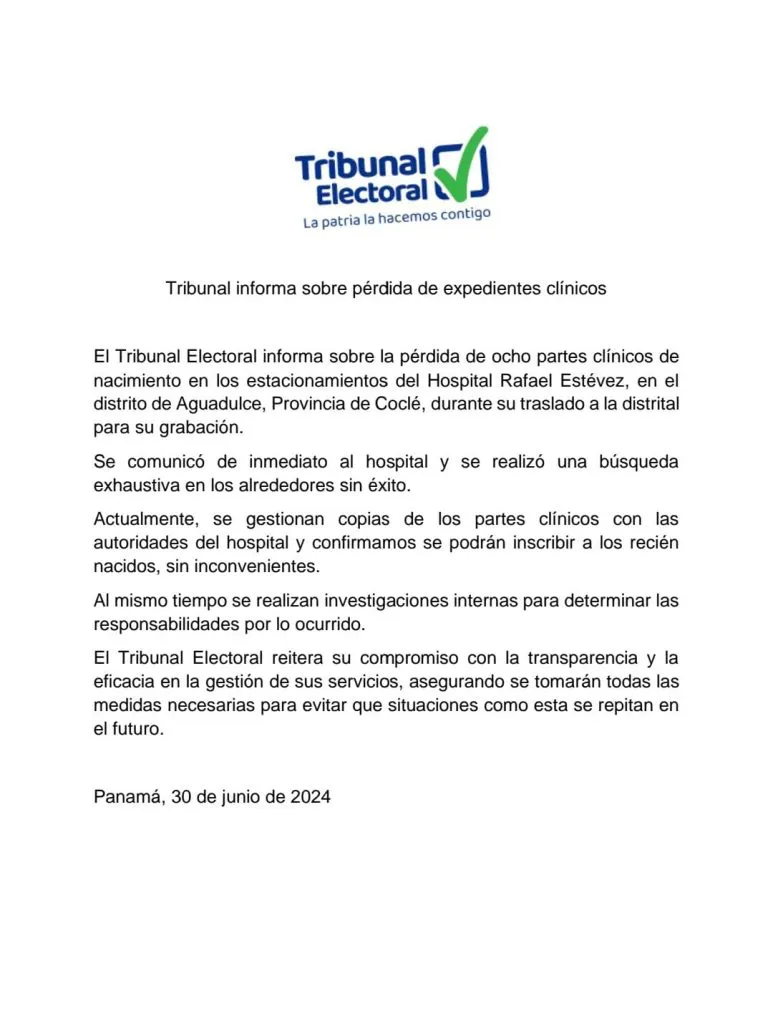 A través de un comunicado de prensa, el Tribunal Electoral (TE) informó que se están llevando a cabo investigaciones internas para determinar las responsabilidades con respecto a la pérdida de ocho partes clínicos de nacimiento en los estacionamientos del Hospital Rafael Estévez, en el distrito de Aguadulce, Provincia de Coclé, durante su traslado a la distrital para su grabación.