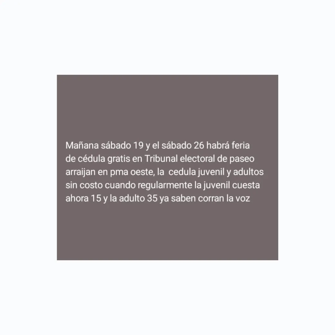 El Tribunal Electoral (TE) no estará realizando una feria de cédulas gratis este fin de semana. Es falso el mensaje que circula en redes sociales, el cual asegura que la institución otorgará, sin costo alguno, este documento de identidad personal a jóvenes y adultos.