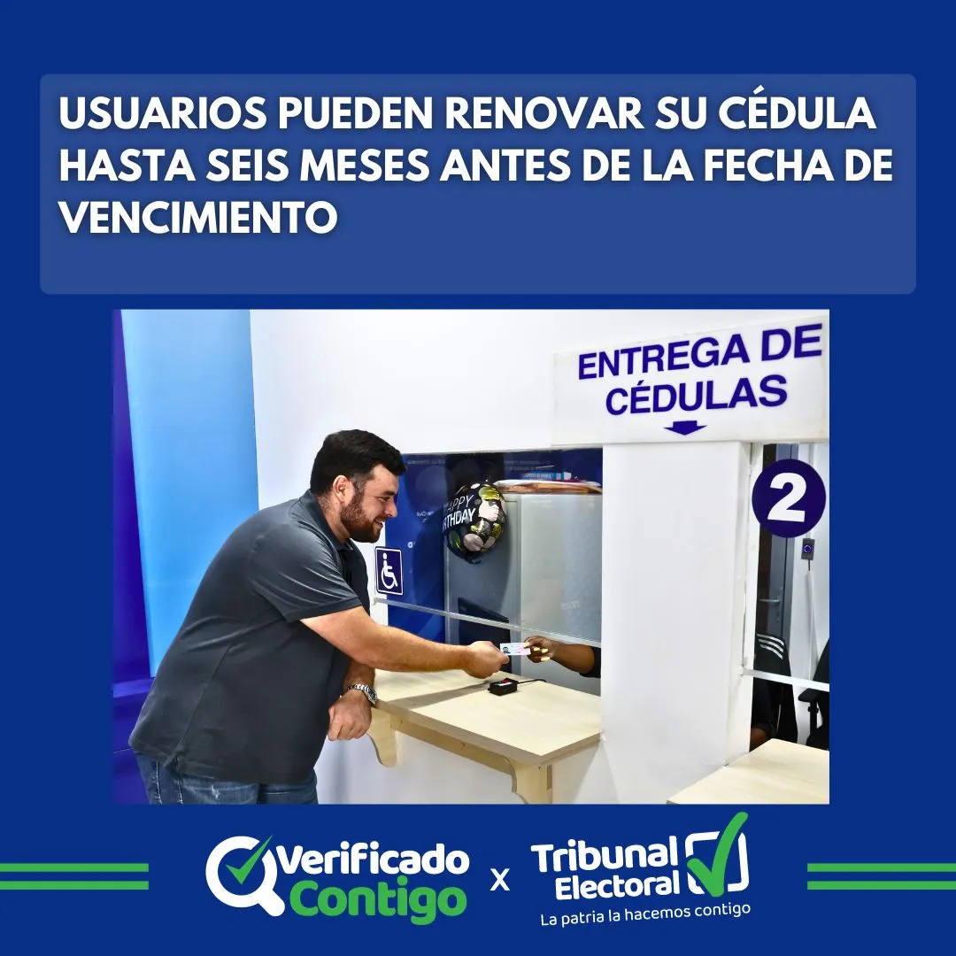 El Tribunal Electoral recuerda a los ciudadanos que pueden renovar su cédula de identidad personal hasta seis meses antes de su fecha de vencimiento, lo que permite ahorrar tiempo y evitar contratiempos. Este trámite es completamente gratuito.